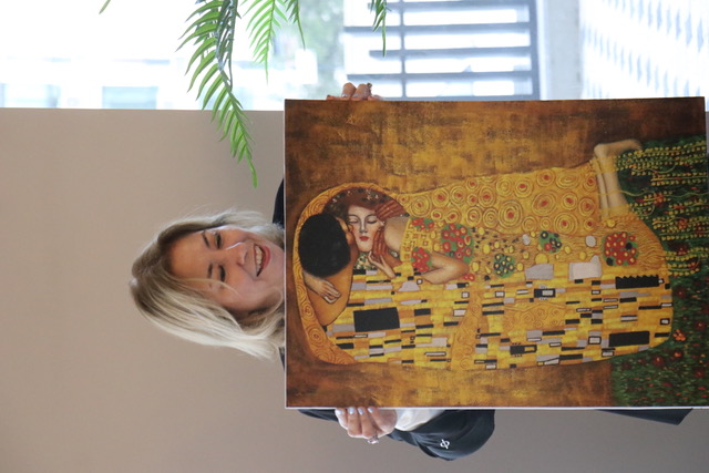 Etkinliğin devamındandı Gustav Klimt’in Kiss (Öpücük) isimli eseri yorumlandı. Eserin şu ana kadar yorumlananın aksine farklı bir pencereden de değerlendirilebileceğinin altını çizen Nur Doğu Koçak, “Eser uçurumun kıyısında bir kadının, uçurumdan kaymamak için zorla biri tarafından tutulduğunu da gösteriyor olabilir. El duruşları ve kadının suratındaki donukluk düşünülünce bu açı da mantıksız değil. Eserde kadının üzerindeki yuvarlak motifler kadınlığı temsil ederken, erkeğin üzerindeki net ve dik çizgiler erkekliği temsil ediyor. Bu resimdeki kadın, kendi isteğiyle Gustav Klimt’in ömründe ikinci kere çizdiği tek kadın olma özelliğini de taşıyor. Gustav Klimt’in altın çağı olarak adlandırılan bu dönemde, babasının bir mücevher sanatçısı olmasının etkileri de açıkça görülüyor. Resimlerinde altını fazlasıyla kullanan Klimt’in bunu yine resimlerine çok iyi şekilde yedirdiğini söyleyebilirim” ifadelerini kullandı.
